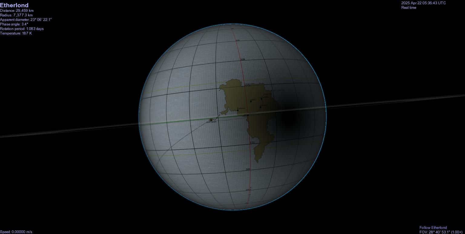 I used my newer map for Onaviu for Etherlond so the size of the shadow can be seen as compared. The eclipses on Onaviu have a regular cycle with very little, if any, variation. Notice shadow is slightly northward? The next eclipse will be across the south polar region above 75°S latitude. The next will be like above image except slightly southward. And the last will be across the north polar region above 75°N latitude. Why? Because I am G.O.D. Gaming Operations Director and I made it that way. >:-P